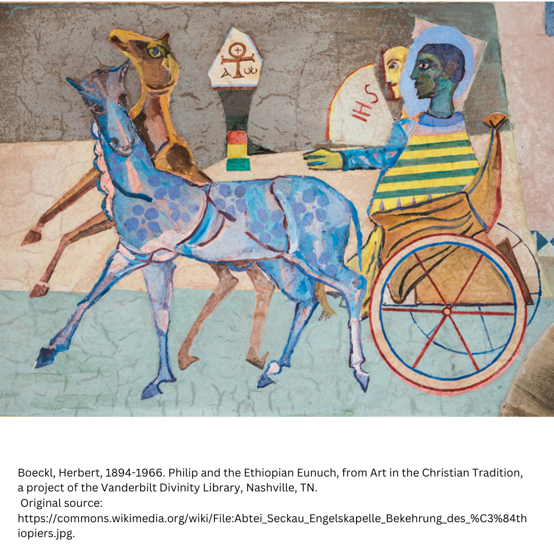 Before you read the story there are some things to keep in mind. You may have been told that eunuchs were only castrated males. Scholars now think that the term “eunuch” was the term used for any sexual minority/gender non conforming person. “Ethiopian” in the story is not from the modern nation of Ethiopia. It was a nation generally south of Egypt, that historically was also known at Cush1 or Nubia and was not part of the Roman Empire. Scholars hold various opinions about whether this person was Jewish or a Gentile.