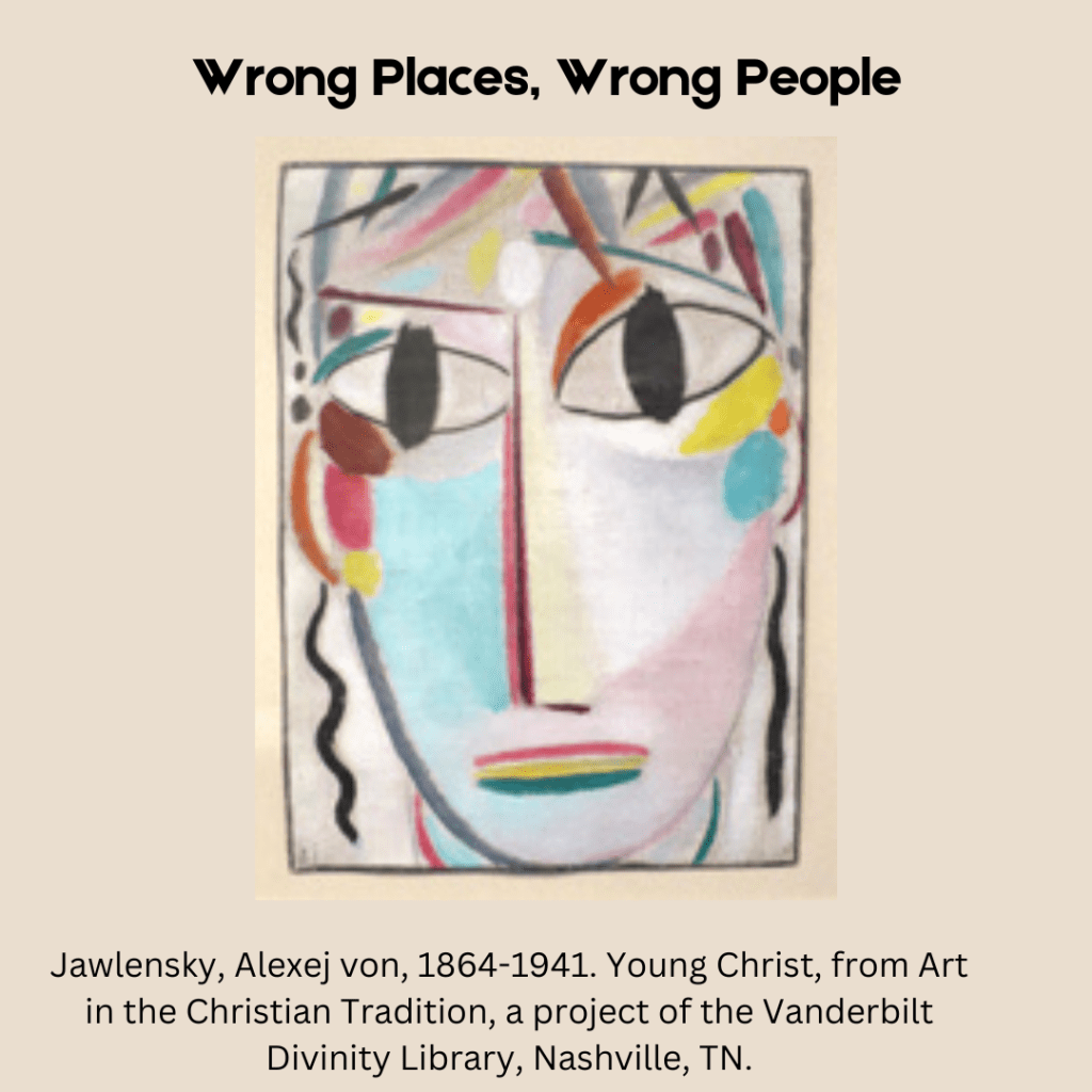 The second story is for Epiphany, the end of the 12 days of Christmas. This is the story of the Magi2 Admittedly Jesus is a little child in this story and so he doesn’t go anywhere. But the “wrong people” are looking for him and they are looking in the “wrong place”. The Magi were gentiles, and not only gentiles- they were astrologers and magicians and therefore somewhat sketchy. They went to worship the king of the Jews. They were the wrong people to be doing this. They had their own king and own gods to worship.