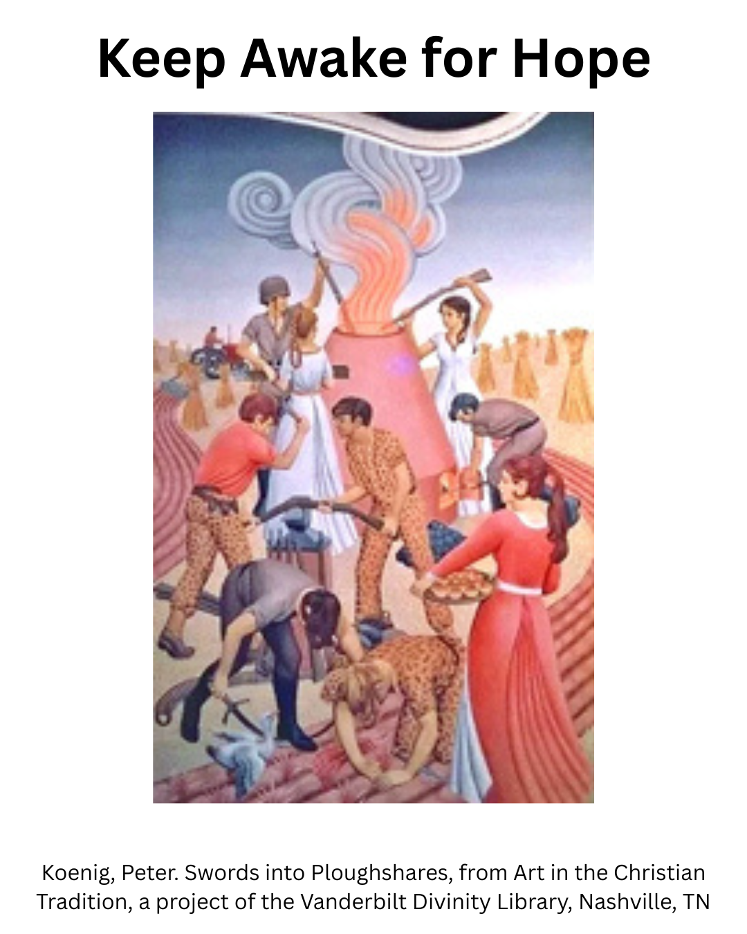 The passage from Isaiah reminds us of why we are awake, what we are watching and hoping for. We are not called to grim endurance. We are called to hope, joy, faith, and love. Hope, in the Bible, is not a wish. Rather hope is a confident expectation. “Hope is the expectation of a favorable future under God’s direction.”5 We are awake when we anticipate with hope, the reign of God where there is no more war. We hope for a world where God, not a king nor an emperor, judges and arbitrates between and for humanity. Notice the image the prophet Isaiah presents. The nations, the people of the world come to the Lord’s house. The Hebrew word translated as “stream” can also be translated as “look with joy”.6 The people come, voluntarily, not by force or coercion or compelled by legislation.7