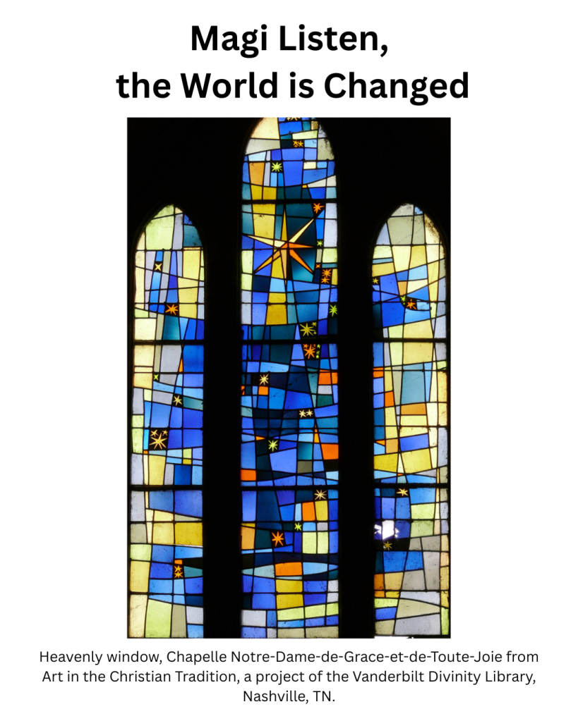 Matthew’s nativity story features Joseph and the Magi as people, unexpected, improbable people, who are listening for what God has to say to them. Joseph is just a guy in a small town who listened to the Angel in a dream ( he doesn’t even get an in person angel visit!). Because he was able to listen well, Mary and Jesus are protected and cared for. The Magi are unexpected people in the story Matthew tells. Yet they played a crucial role in keeping the Holy Family safe by not collaborating with King Herod.